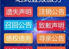公告发布类型:遗失声明、注销公告、减资公告清算公告、合并公告、分立公告催款公告、拆迁公告、致歉公告、迁坟公告、法院公告、送达公告开业公告、破产公告、协查公告海事公告、招标公告、免责公告冒用声明企业迁址公告、房屋权属转移公告股权转让公告、解除
