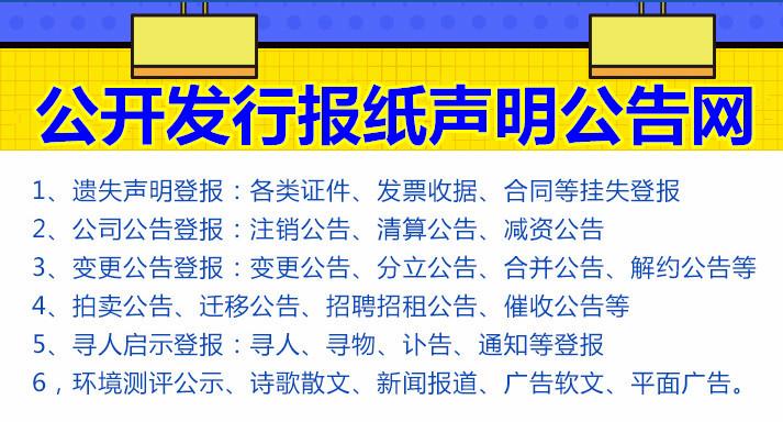 登报声明公告,指尖上的登报专项 登报电话(400--638--9568) 登报登报声明公告旨在解决传统登报繁琐、耗时的难题。它整合了丰富的媒体资源,操作界面简洁直观,让您足不出户就能搞定各类登报事宜,国际商报遗失声明登报也不例外。无论是营业执照、税务登记证,还是其他重要票据在国际商报上的遗失声明,登报帮都能精准对接,为您提供专业服务。