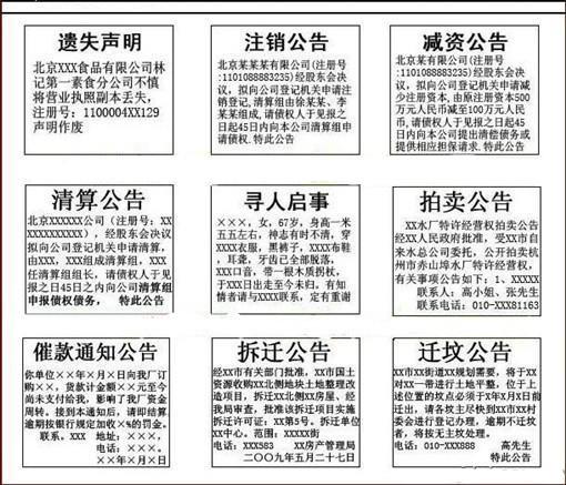 登报内容:营业执照、税务登记证、银行开户许可证、组织机构代码证、公章、财务章、发票丢失、外国人就业证、专家证、建筑资格证及各类证件遗失、挂失声明注销公告、减资公告、清算公告、拍卖公告、法院公告、催款公告、解除劳动合同公告、致歉公告、债权转让公告、维权公告、寻人启示广告及各类公告公示登报等信息发布。